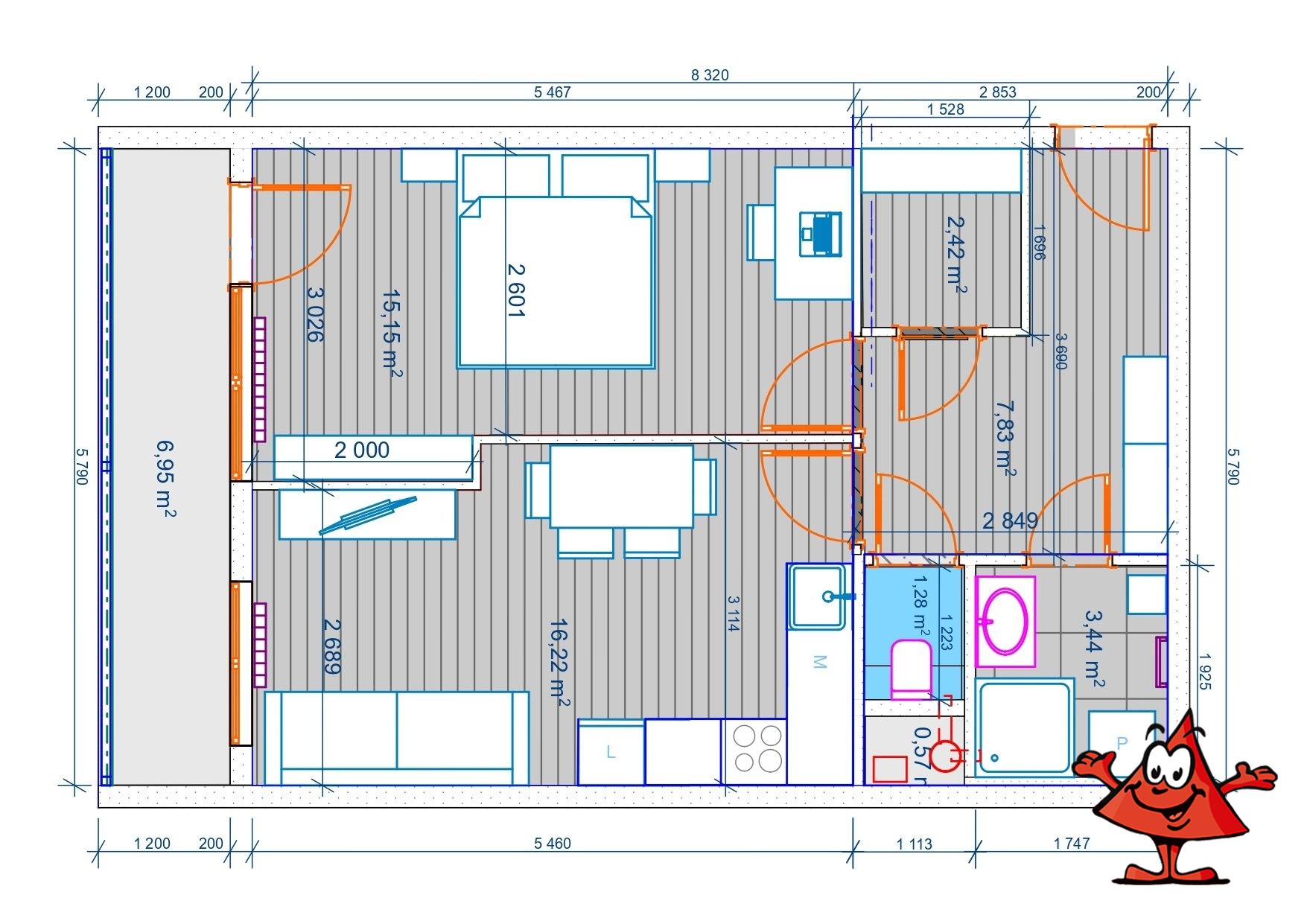 Obývací pokoj s kuchyňským koutem 16,22 m2, ložnice 15,15 m2, lodžie 6,95 m2, šatna 2,42 m2, komora na chodbě cca 4 m2.