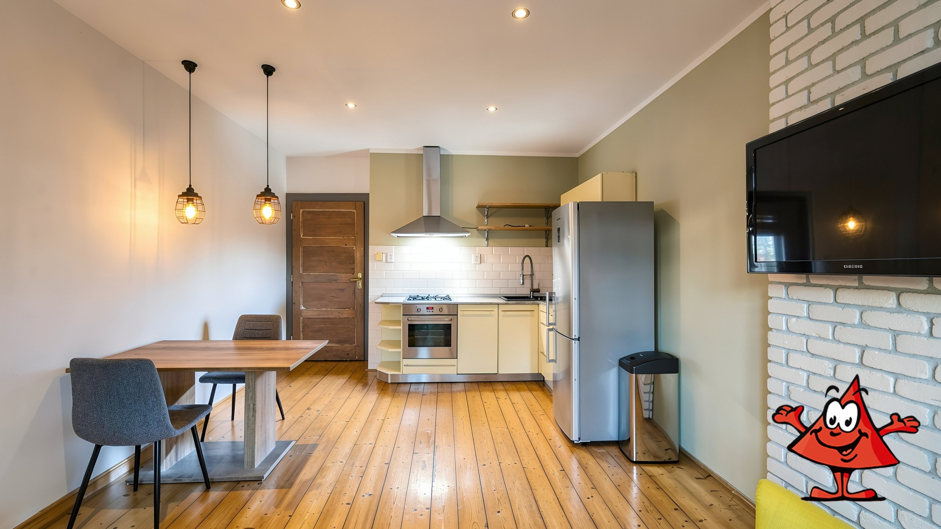 V obývacím pokoji plnohodnotná kuchyňská linka osazená sklokeramickou deskou, horkovzdušnou troubou, digestoří, myčkou a lednicí, dále jídelní stůl, konferenční stolek, sedačka a televize. V ložnici je dvoupostel a rozměrná šatní skříň. V obývacím pokoji podlaha dřevěná, v ložnici plovoucí, v předsíni PVC, v koupelně a na WC dlažba.