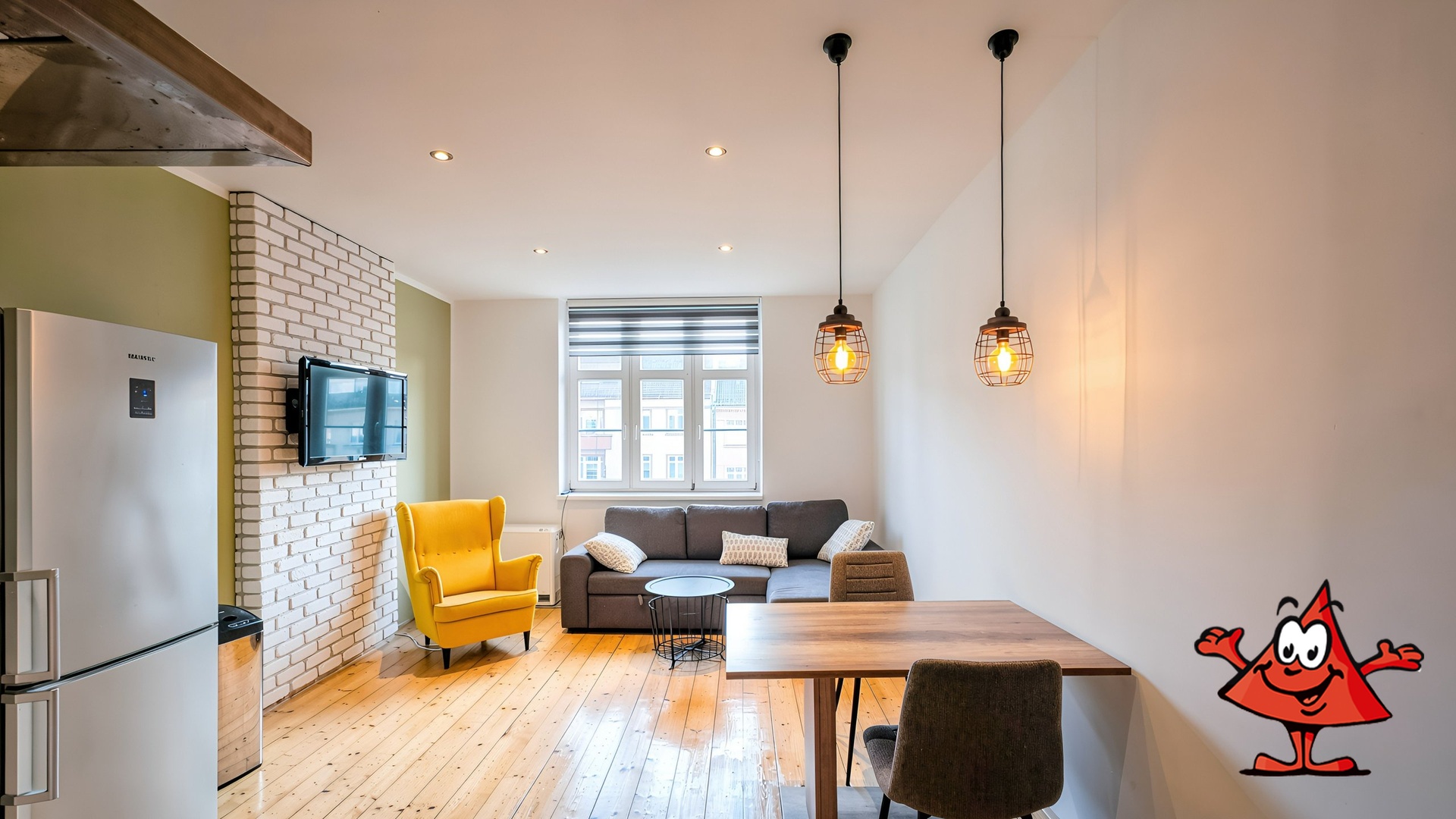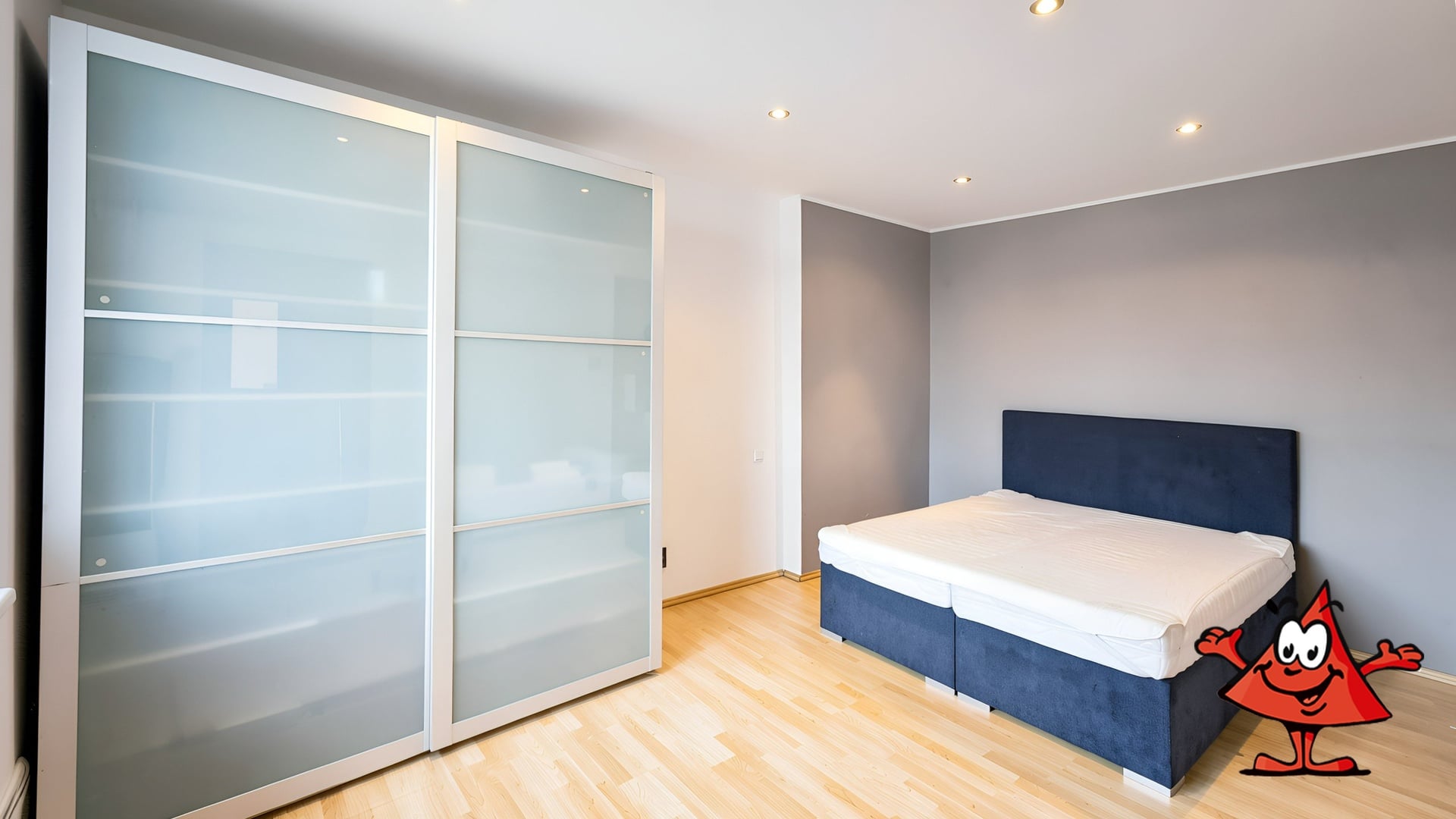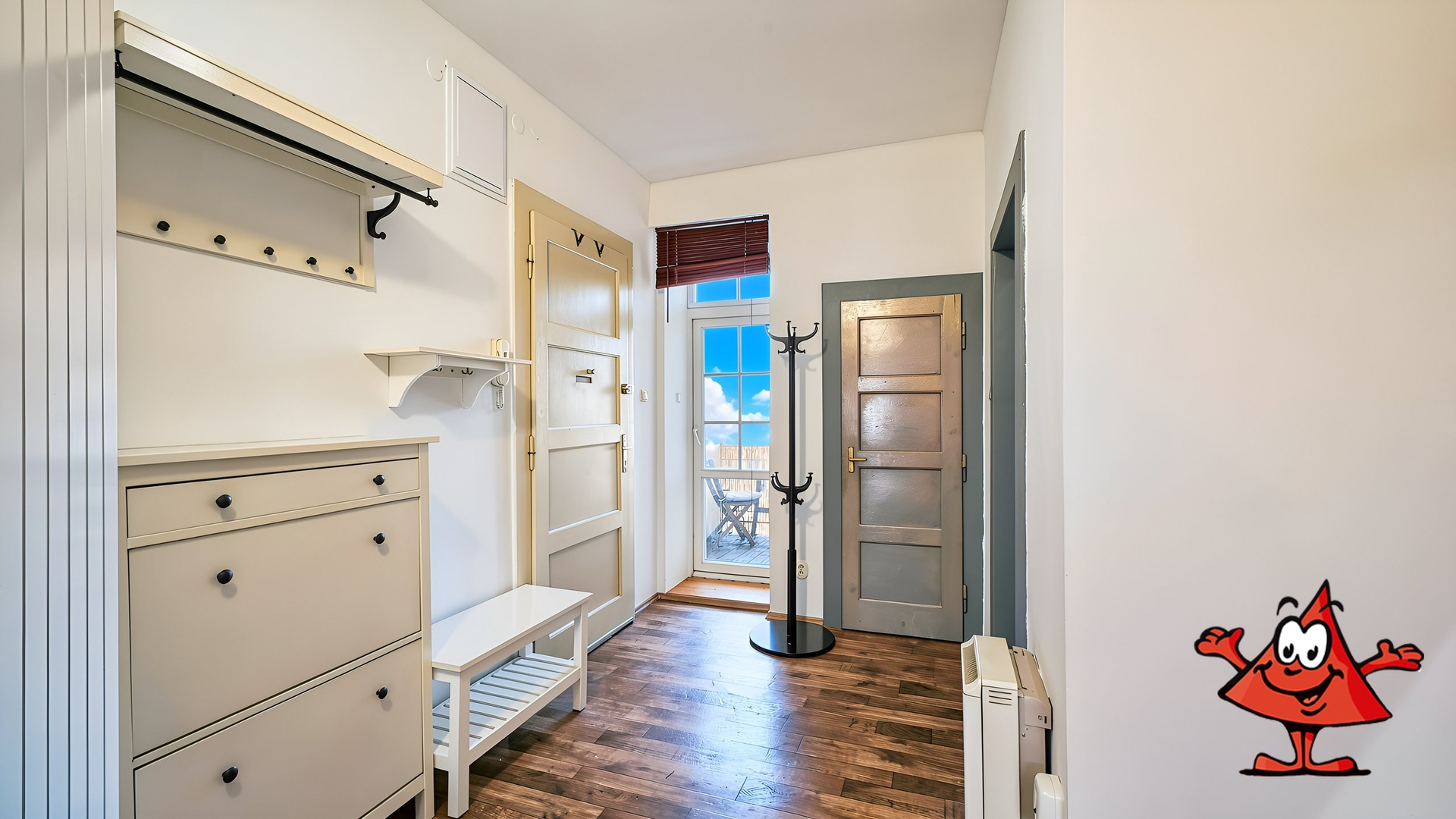 Byt je velmi dobře dispozičně řešen: do všech místností jsou samostatné vstupy z předsíně, koupelna a WC jsou oddělené, ložnice je orientovaná na severovýchod a díky velkým oknům má dostatek světla, při tom v létě netrpí přehříváním.